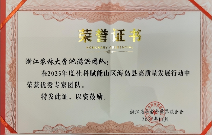 11月26日至27日,全省社科赋能山区海岛县高质量发展行动工作推进会在丽水市召开。会议对优秀组织单位和优秀专家团队进行了通报表扬并颁发荣誉证书。我校被授予“优秀组织单位”,沈满洪教授团队入选“优秀专家团队”。