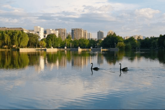 天鹅戏水,荷花亭立