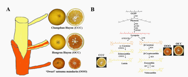 β-隐黄质是一种具有更高生物利用度的膳食维生素原A类胡萝卜素,只在柑橘等极少数作物中积累。但是,柑橘品种间的β-隐黄质含量存在显著差异,只有少数宽皮橘类(mandarin)在成熟果实中大量积累β-隐黄质,而大多数甜橙果实主要积累紫黄质,柚类和葡萄柚等果实较大的柑橘品种中β-隐黄质含量极低。嫁接形成的周缘嵌合体可以产生优良的跨种品种,是柑橘中至关重要的育种策略。新发掘的周缘嵌合体OCC(红肉胡柚) 结合了其一个供体CCC(常山胡柚)大果型和另一个供体OOO(温州蜜柑)富含β-隐黄质的理想农艺性状。针对OCC的遗传起源及其β-隐黄质积累的分子机制,本研究系统分析了OCC及其供体果实的代谢谱与基因表达谱,揭示了其果实各组织的细胞层发育模型,OCC的L1细胞层来自OOO,L2和L3细胞层来自CCC;OCC的外果皮、果肉和囊衣均由两个供体细胞发育而来,但每个组织中两个供体的组成比例不同;OOO:CCC(L1:L2/L3)在外果皮中约为1:4,果肉中约为1:1,囊衣中约为1:3。研究还鉴定出一个与β-隐黄质的积累密切相关并定位于细胞核的转录激活因子MYB107,其在柑橘愈伤组织和果实中的过表达可增强类胡萝卜素的生物合成并上调类胡萝卜素生成基因,而干扰MYB107的表达则表现出相反的效果。MYB107直接结合并激活β-胡萝卜素羟化酶(BCH)的启动子,从而正向调控β-隐黄质的生物合成。此外,MYB107的表达水平与不同柑橘品种中β-隐黄质的积累水平一致。