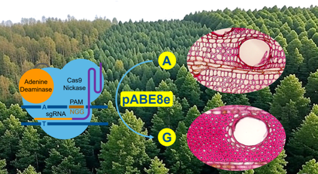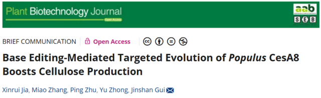 近日,浙江农林大学桂金山教授团队在国际知名期刊《Plant Biotechnology Journal》在线发表题为“Base Editing-Mediated Targeted Evolution ofPopulusCesA8 Boosts Cellulose Production”(《碱基编辑介导的杨树CesA8基因定向进化促进纤维素产量提升》)的研究论文。该研究通过引入高效脱氨酶TadA8e和广谱识别SpRY-Cas9变体,构建出新型腺嘌呤碱基编辑器pABE8e,系统靶向修饰了杨树纤维素合酶复合体中的多个基因(CesA8CSI1KOR),成功实现对纤维素合成关键基因CesA8的定向进化,显著提高了杨树的纤维素产量和木纤维品质。