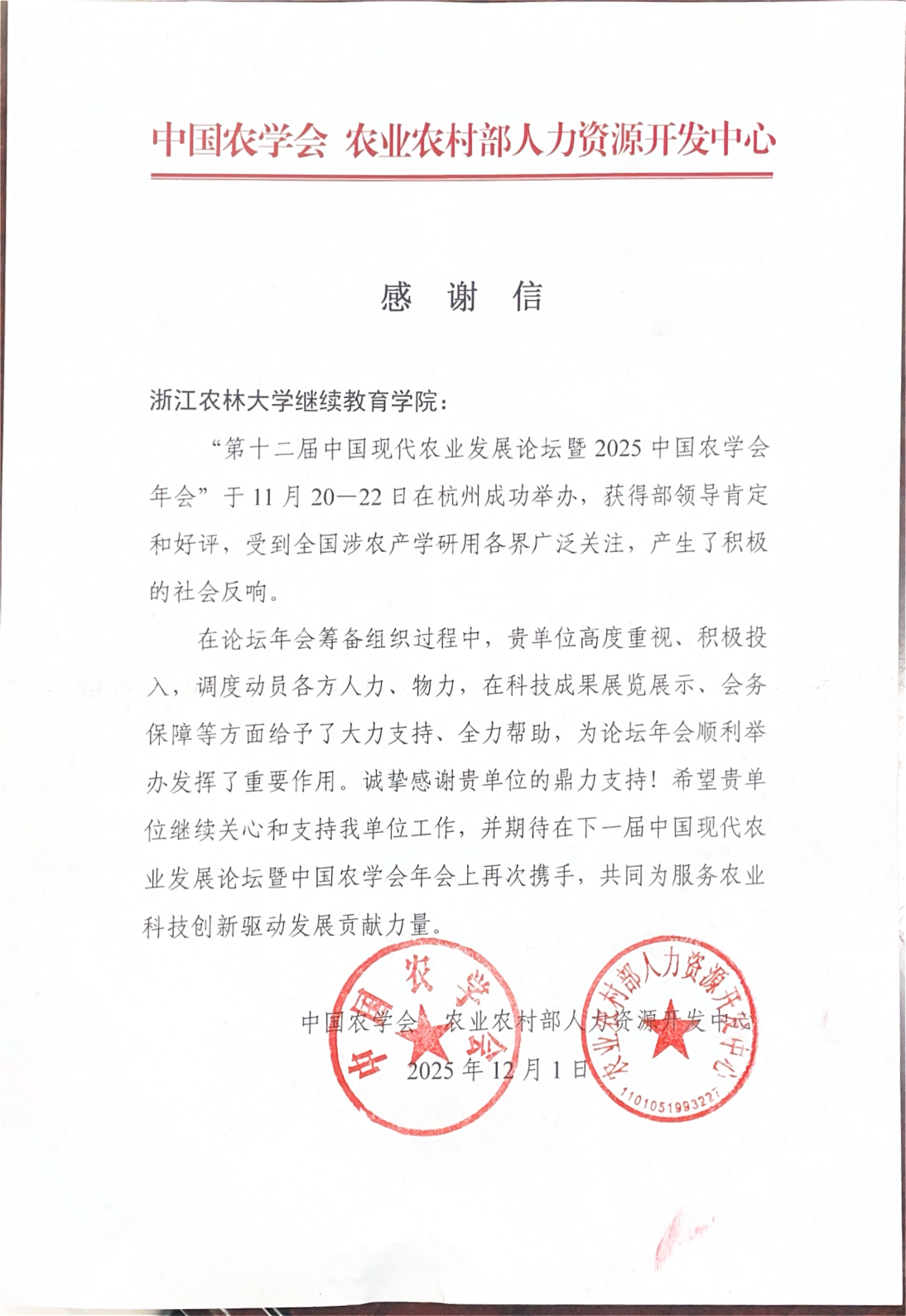 近日,我校收到来自中国农学会与农业农村部人力资源开发中心的联名感谢信,信中对我校在“第十二届中国现代农业发展论坛暨2025中国农学会年会”筹备与举办过程中所提供的支持表示高度认可和诚挚感谢。